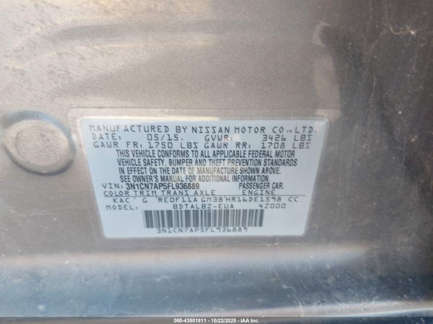 2015 NISSAN VERSA 1.6 SV VIN: 3N1CN7AP5FL936889 LOT: 43501811