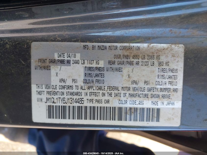 2018 MAZDA MAZDA6 GRAND TOURING VIN: JM1GL1TY6J1314485 LOT: 43429849