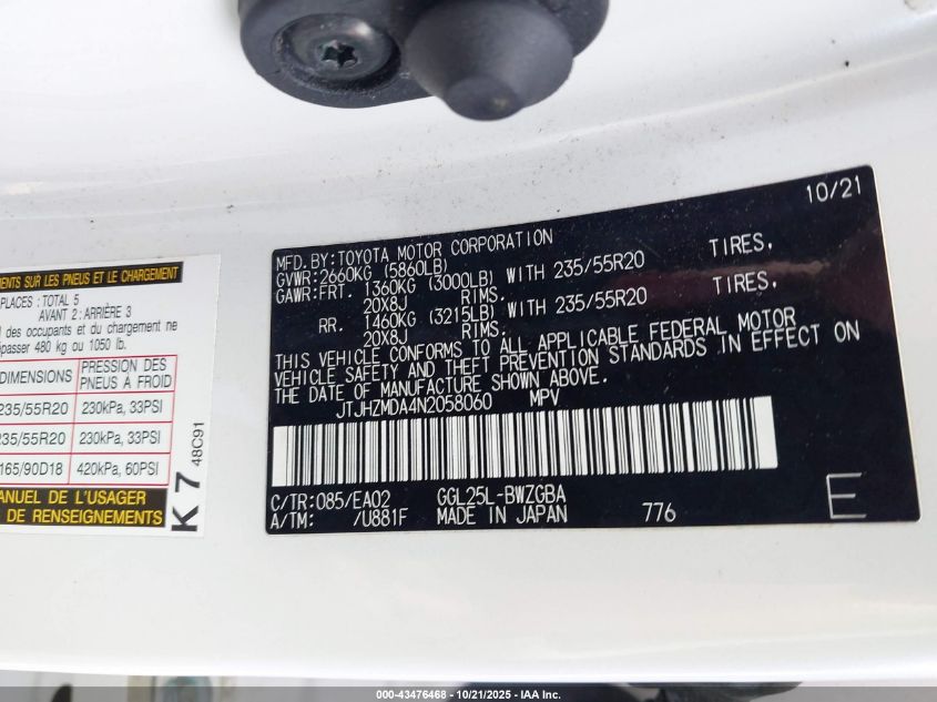 2022 LEXUS RX 350 VIN: JTJHZMDA4N2058060 LOT: 43476468