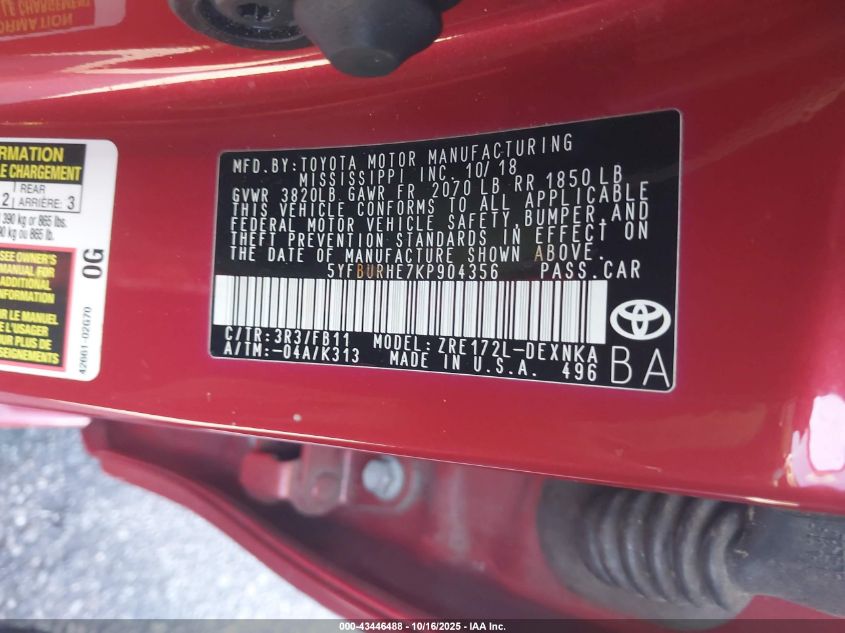2019 TOYOTA COROLLA LE VIN: 5YFBURHE7KP904356 LOT: 43446488