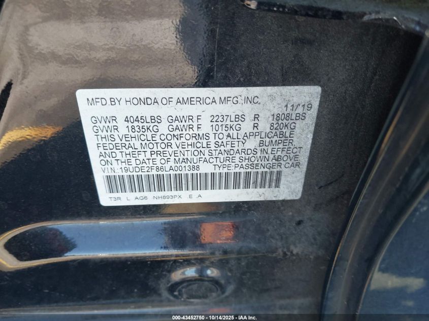 2020 ACURA ILX PREMIUM A-SPEC PACKAGES/W/TECHNOLOGY/A-SPEC PKG VIN: 19UDE2F86LA001388 LOT: 43452750