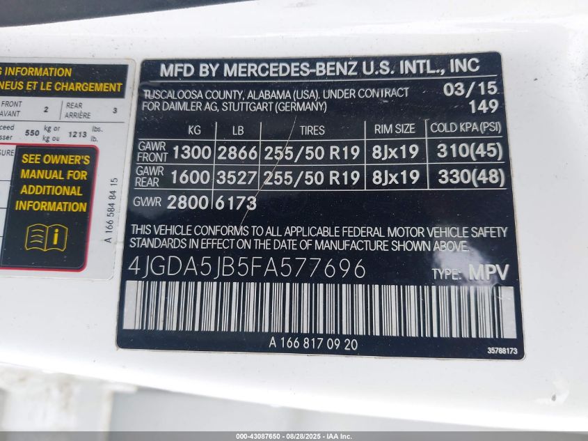2015 MERCEDES-BENZ ML 350 VIN: 4JGDA5JB5FA577696 LOT: 43087650