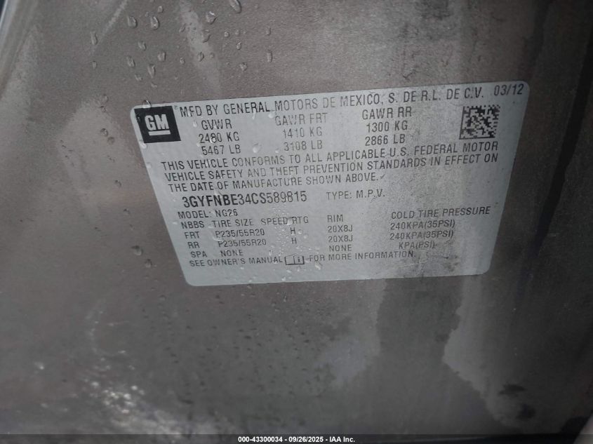 2012 CADILLAC SRX PERFORMANCE COLLECTION VIN: 3GYFNBE34CS589815 LOT: 43300034