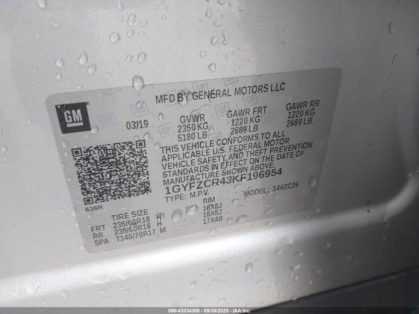 2019 CADILLAC XT4 VIN: AGYFZCR43KF196954 LOT: 43334388