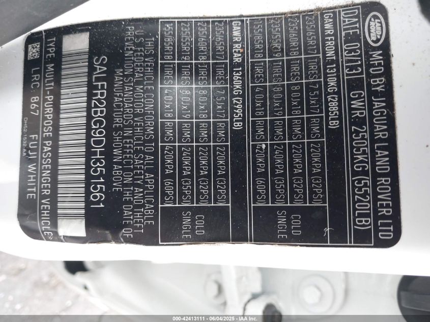 2013 LAND ROVER LR2 VIN: SALFR2BG9DH351561 LOT: 42413111