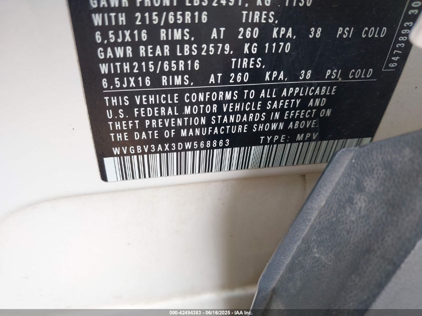 2013 VOLKSWAGEN TIGUAN S VIN: WVGBV3AX3DW568863 LOT: 42494383