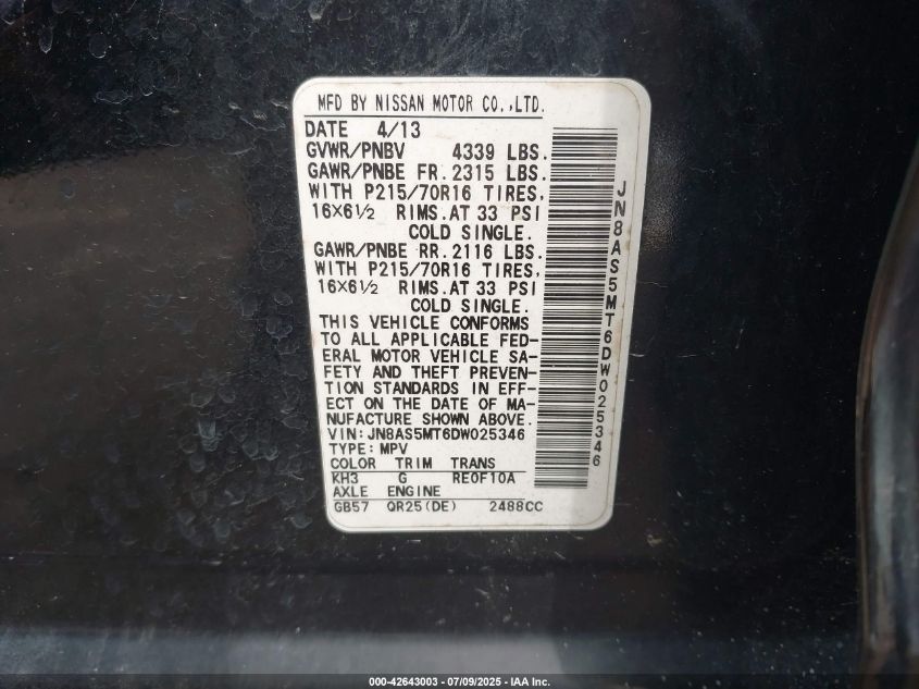2013 NISSAN ROGUE S VIN: JN8AS5MT6DW025346 LOT: 42643003
