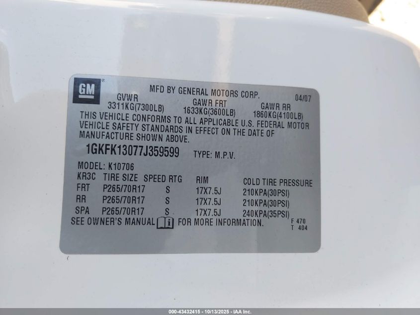 2007 GMC YUKON SLT VIN: 1GKFK13077J359599 LOT: 43432415