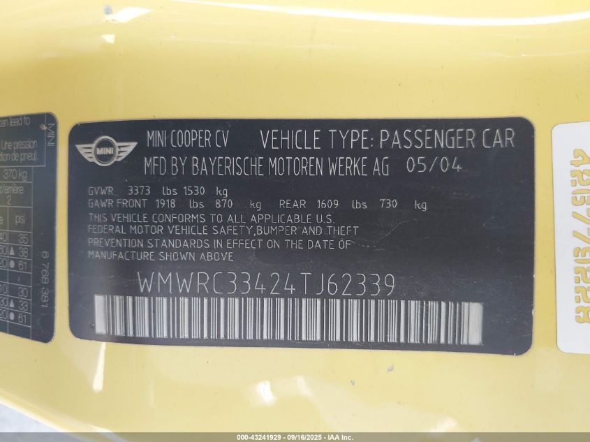 2004 MINI COOPER VIN: WMWRC33424TJ62339 LOT: 43241929