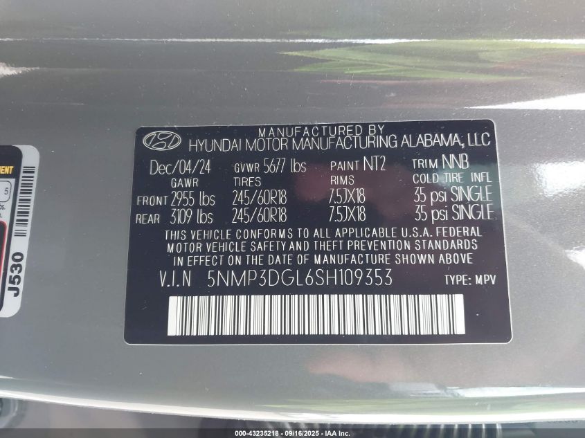 2025 HYUNDAI SANTA FE XRT VIN: 5NMP3DGL6SH109353 LOT: 43235218