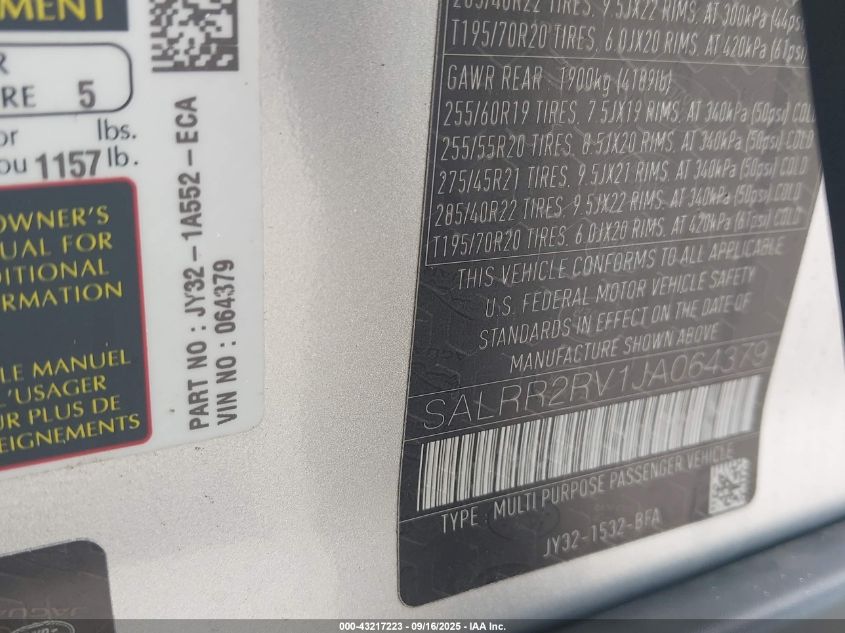 2018 LAND ROVER DISCOVERY HSE VIN: SALRR2RV1JA064379 LOT: 43217223
