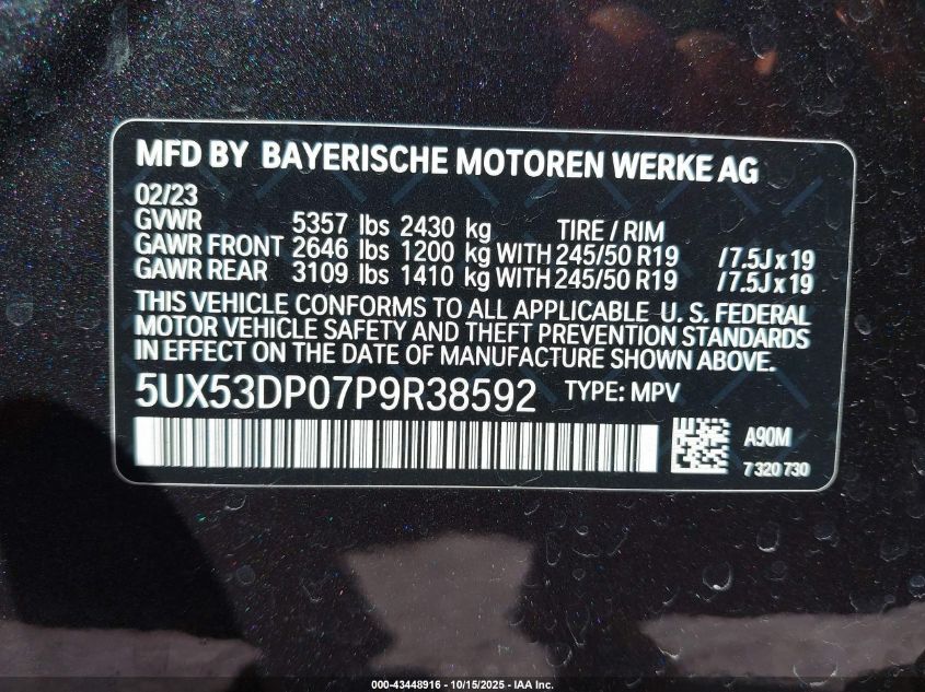 2023 BMW X3 XDRIVE30I VIN: 5UX53DP07P9R38592 LOT: 43448916