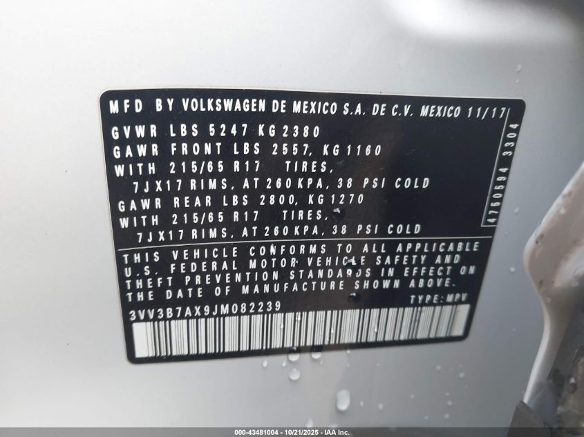 2018 VOLKSWAGEN TIGUAN 2.0T SE/2.0T SEL VIN: 3VV3B7AX9JM082239 LOT: 43481004